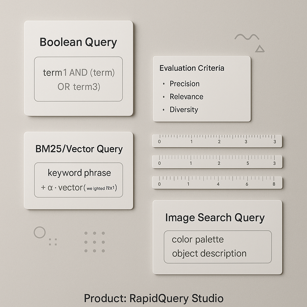 A compact, stack‑agnostic system for crafting high‑precision queries and ranking rules. Includes 40+ Boolean/BM25/hybrid templates, scoring and tie‑breaking recipes, a relevance grading rubric (L0–L3), score fusion (RRF, z‑score), and a mini‑workbook to diagnose topic drift and lexical gaps. Compatible with Elasticsearch/OpenSearch, Solr, Meilisearch, Typesense, Vespa, and vector DBs (FAISS, Milvus, pgvector, Pinecone, Qdrant). Ships with JSON/YAML templates and a rubric spreadsheet. KPIs: NDCG@10, MRR, success‑click rate, time‑to‑first‑useful.